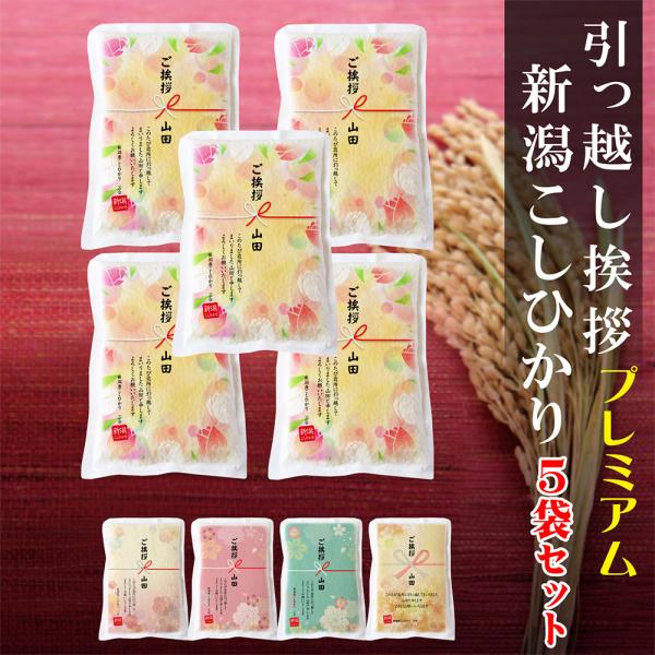 新しいお住まいの近所の方々へのご挨拶に、新潟県産のコシヒカリ3合を5袋セットでお届けします。